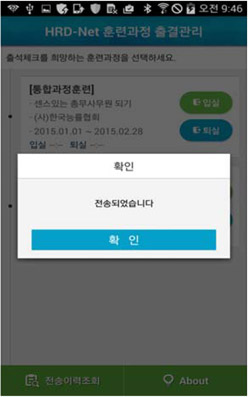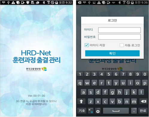¡Û Ãâ°á°ü¸® ¾Û(app) ½ÇÇà ÈÄ HRD-Net ȸ¿ø¾ÆÀ̵ð¿Í ºñ¹Ð¹øÈ£¸¦ ÀÔ·ÂÇÑ ÈÄ È®ÀÎ ¹öưÀ» Ŭ¸¯ÇÕ´Ï´Ù.