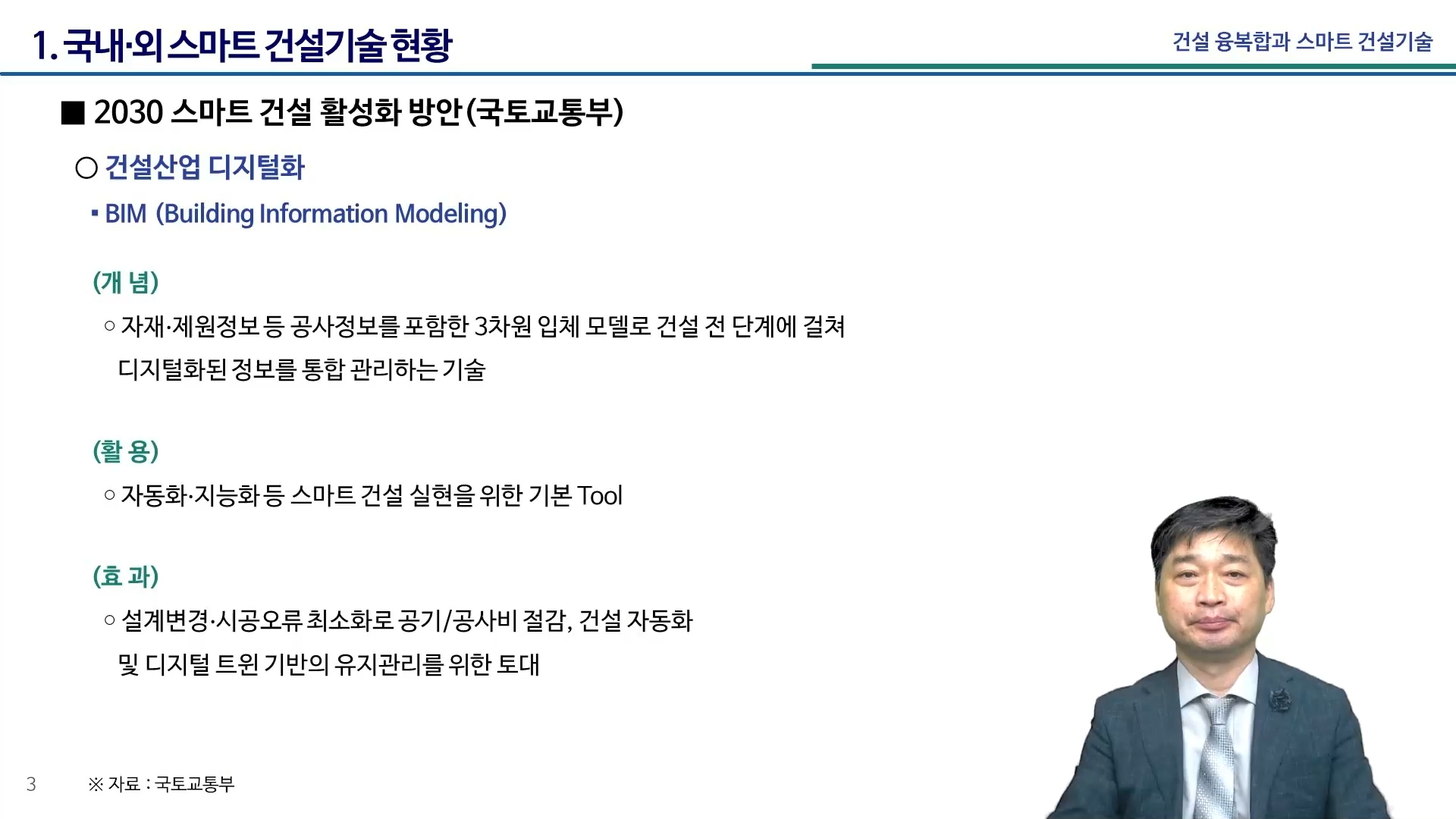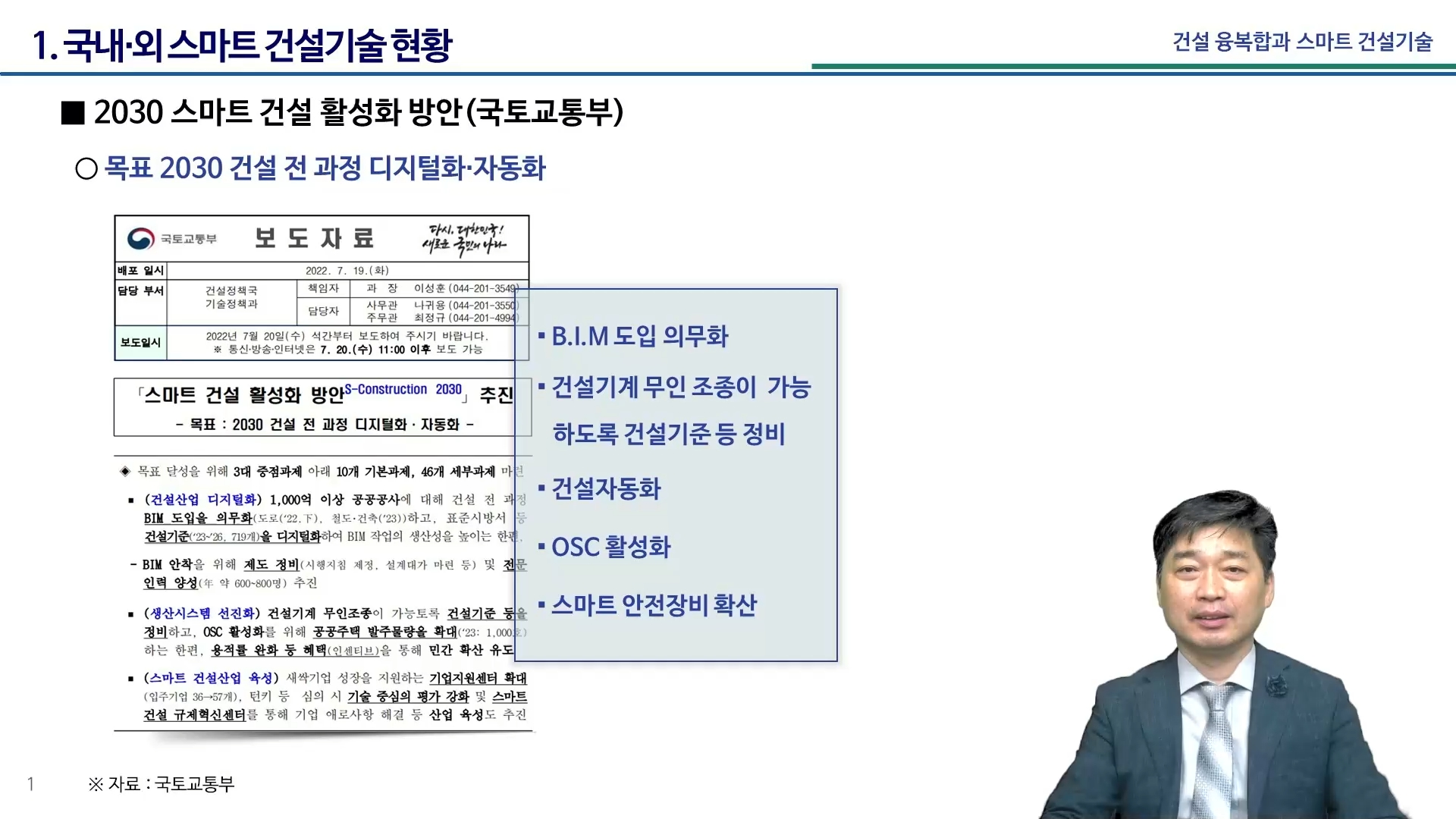 - ¢Â ½º¸¶Æ®°Ç¼³±â¼úÀÇ Á¤ÀÇ¿Í ¹ßÀü ¹è°æÀ» ÀÌÇØÇÑ´Ù. ¢Â 2030 ½º¸¶Æ®°Ç¼³ Ȱ¼ºÈ Á¤Ã¥(±¹Åä±³ÅëºÎ ¹ßÇ¥)ÀÇ ÁÖ¿ä Àü·«À» ÆÄ¾ÇÇÑ´Ù. ¢Â BIM, °Ç¼³ÀÚµ¿È, OSC, ½º¸¶Æ® ¾ÈÀüÀåºñ µîÀÇ ÇÙ½É ±â¼ú °³³äÀ» ¼Ò°³ÇÑ´Ù. ¢Â °Ç¼³»ê¾÷ÀÇ µðÁöÅÐ Àüȯ È帧 ¼Ó¿¡¼ ±â¼úµµÀÔÀÇ Çʿ伺°ú ±â´ëÈ¿°ú¸¦ ÀνÄÇÑ´Ù.